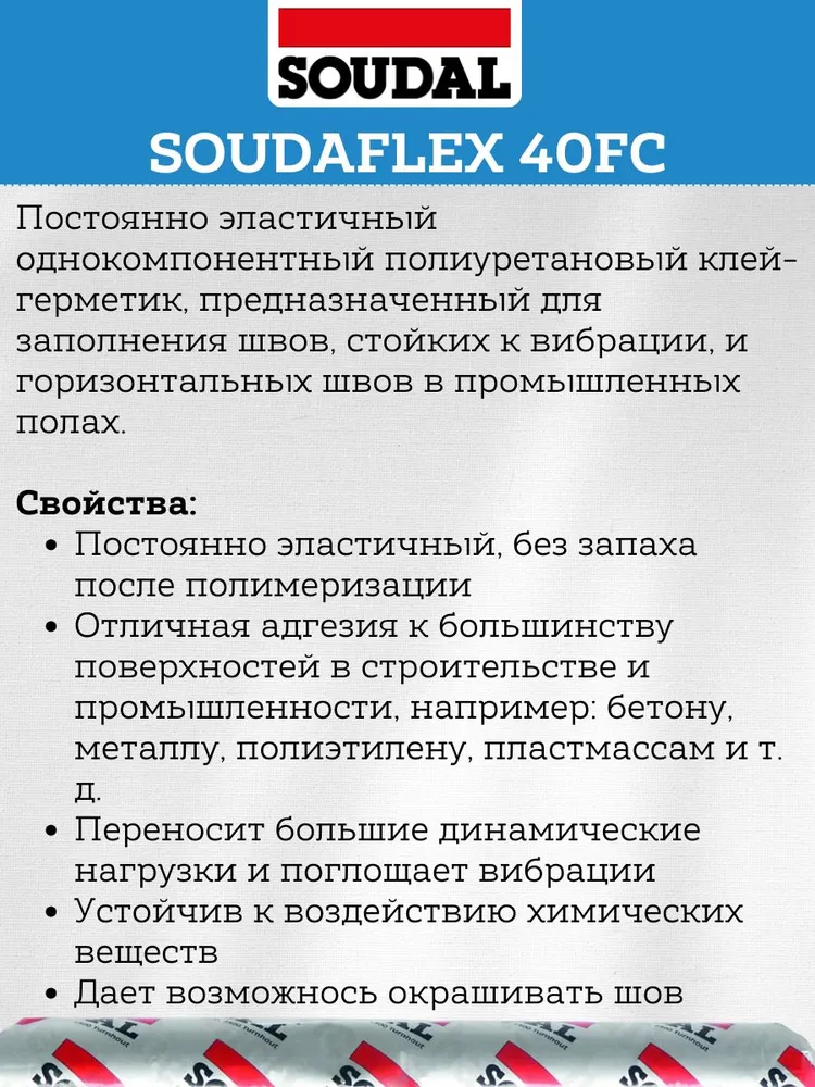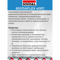 Выбирая полиуретановый герметик Soudaflex 40FC, вы получаете надежный и долговечный продукт, который обеспечит герметичность и прочность ваших конструкций.