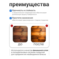 Лак отличается высокой прочностью и износостойкостью, что обеспечивает защиту от воздействия влаги и других негативных проявлений. Он также повышает прочность сцепления лакокрасочных материалов с высокими декоративными свойствами при соблюдении технологии нанесения, правил хранения и транспортирования.