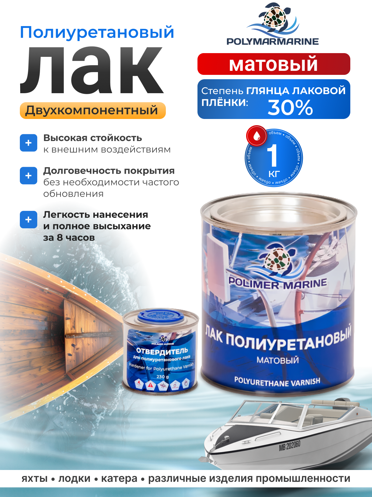 Полиуретановый матовый лак Polimer Marine 2К комплект 1кг представляет собой двухкомпонентный лак, предназначенный для защитно-декоративного окрашивания различных поверхностей и изделий. Он используется в качестве финишного покрытия, придающего матовый блеск, и наносится на предварительно окрашенную поверхность.