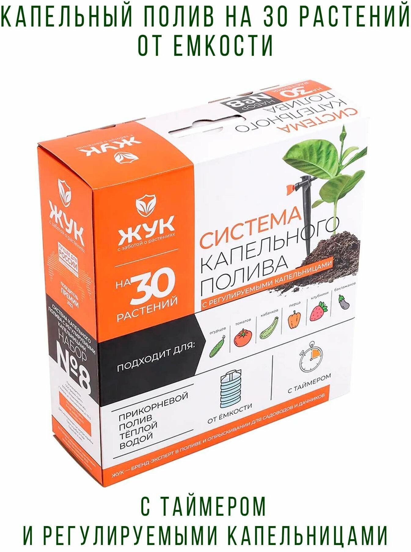 В наборе ЖУК есть все необходимое, что быстро и своими руками организовать капельный полив на дачном или садовом участке. Установка займет не более 30 минут!