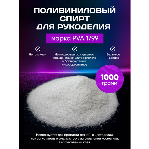 Поливиниловый спирт имеет белый цвет и поставляется в удобной упаковке весом 1000 грамм. Это гарантирует, что вы получите достаточное количество продукта для своих творческих проектов.