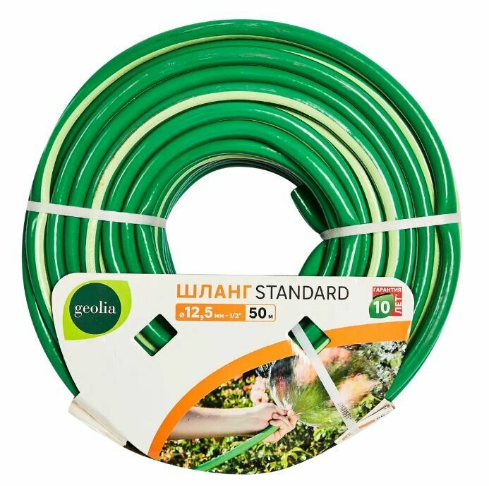 Шланг для полива Geolia Standart используется для полива растений, мойки автомобиля и других хозяйственных работ в любой точке участка. Мобильный и быстро подключаемый аксессуар позволяет обойтись без прокладки стационарных линий водопровода. Размер — 12,5 мм. Длина шланга — 50 м.