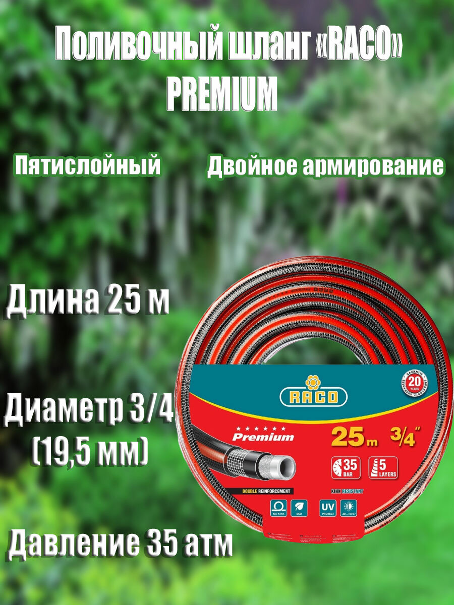 Поливочный шланг RACO Premium 3/4″ 25 м 35 атм пятислойный усиленный: сравнение цен, характеристики, фото, актуальное наличие и цены.