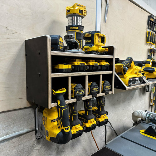 Универсальная полка с 4 держателями для шуруповёртов. Сделана из ламинированной фанеры толщиной 15 мм. Собирается на евровинты. Для гаража, мастерской, небольшого цеха. С запасом прочности.