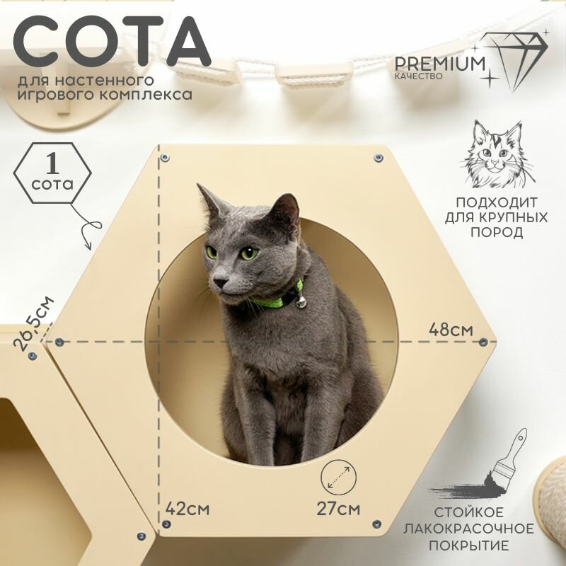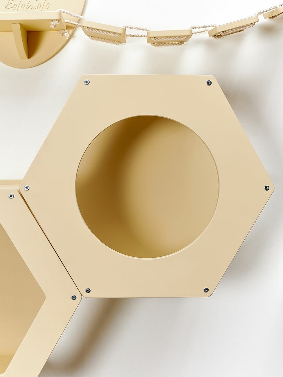 Настенная полка для кошек в форме соты – это стильный и функциональный элемент игрового комплекса, который подарит вашему питомцу собственное пространство для лазания, наблюдения и отдыха. Благодаря компактному настенному креплению она позволяет экономить место, а уникальный дизайн в виде сот гармонично вписывается в любой интерьер. Полка идеально подходит как самостоятельное место для отдыха, так и в комбинации с другими модулями – мостиками, когтеточками и ступеньками.