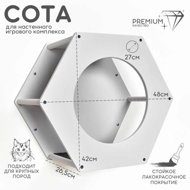 Настенная полка для кошек в форме соты – это стильный и функциональный элемент игрового комплекса, который подарит вашему питомцу собственное пространство для лазания, наблюдения и отдыха. Благодаря компактному настенному креплению она позволяет экономить место, а уникальный дизайн в виде сот гармонично вписывается в любой интерьер. Полка идеально подходит как самостоятельное место для отдыха, так и в комбинации с другими модулями – мостиками, когтеточками и ступеньками.