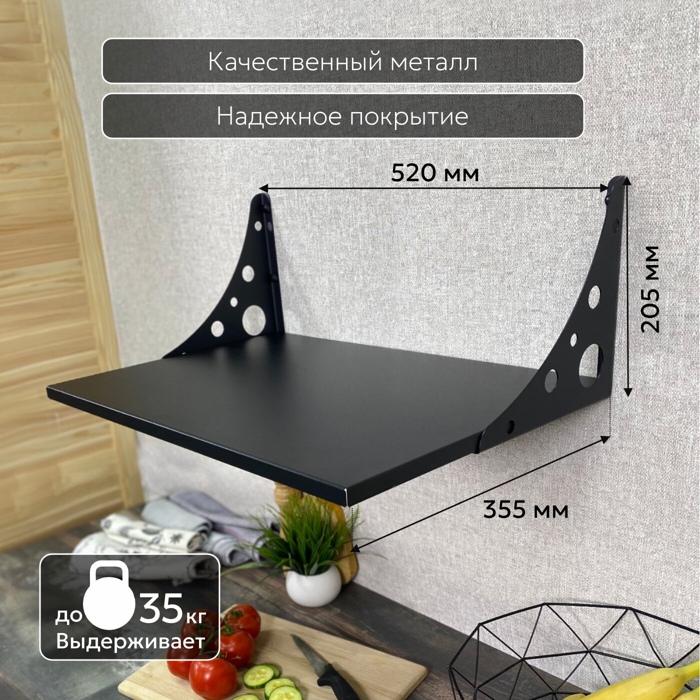 Фиксированный тип кронштейна обеспечивает устойчивость полки и позволяет выдерживать максимальную нагрузку до 35 кг.