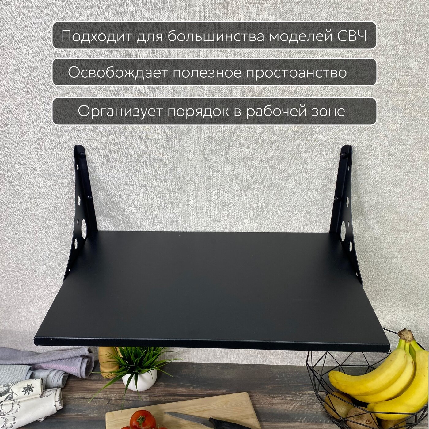 Полка имеет оптимальные размеры (ширина и высота), что позволяет разместить СВЧ печи практически любых габаритов.