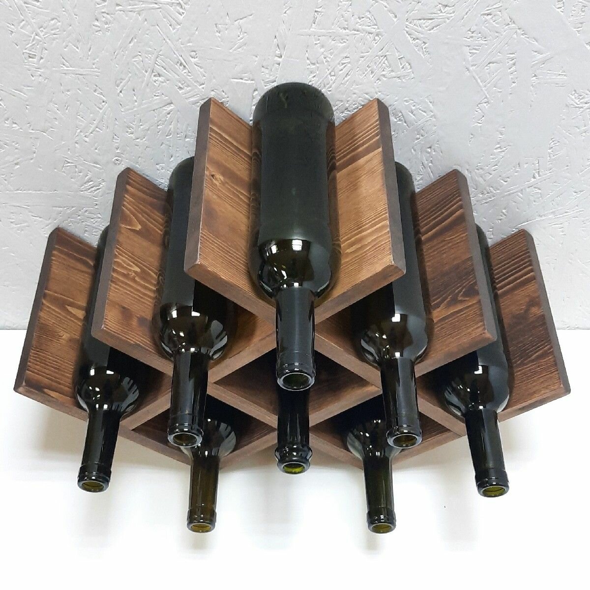 Полка винная на 8 бутылок. Большие ячейки вместят любые бутылки вина, шампанского и других напитков. Массивная, надежная полка, можно ставить на стол, в нишу. Материал: 100% дерево сосна, ручная работа. Доставляется в собранном виде. Цвет грецкий орех, покрытие немецким натуральным маслом. Размеры изделия без бутылок: Высота 35 см, глубина 20 см, ширина 51 см. Высота с верхней бутылкой 37-39 см, глубина полки с винной бутылкой 30-32 см, в зависимости от бутылки. Можно ставить и вешать (на задней стенке мебельный подвес). Подставка для винных бутылок будет роскошным подарком на любой праздник, торжество, новоселье. Масло для дерева Biofa - это не только красивый и элегантный способ защиты древесины, но и эффективный метод продления жизни поверхности дерева. Отличительной особенностью является его способность проникать вглубь древесины, создавая защитный барьер, который сохраняет её красоту и целостность на долгие годы.