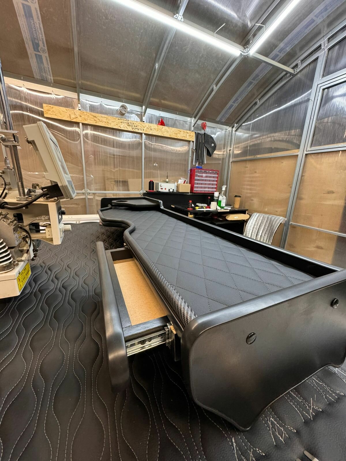 Стол в кабину для MAN TGA TGL XXL шир. кабина. 2 Яруса Синяя экокожа Чёрный ромб