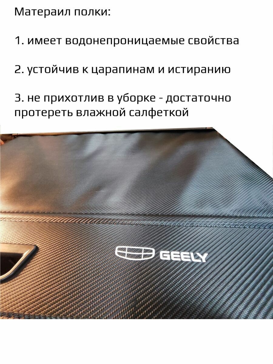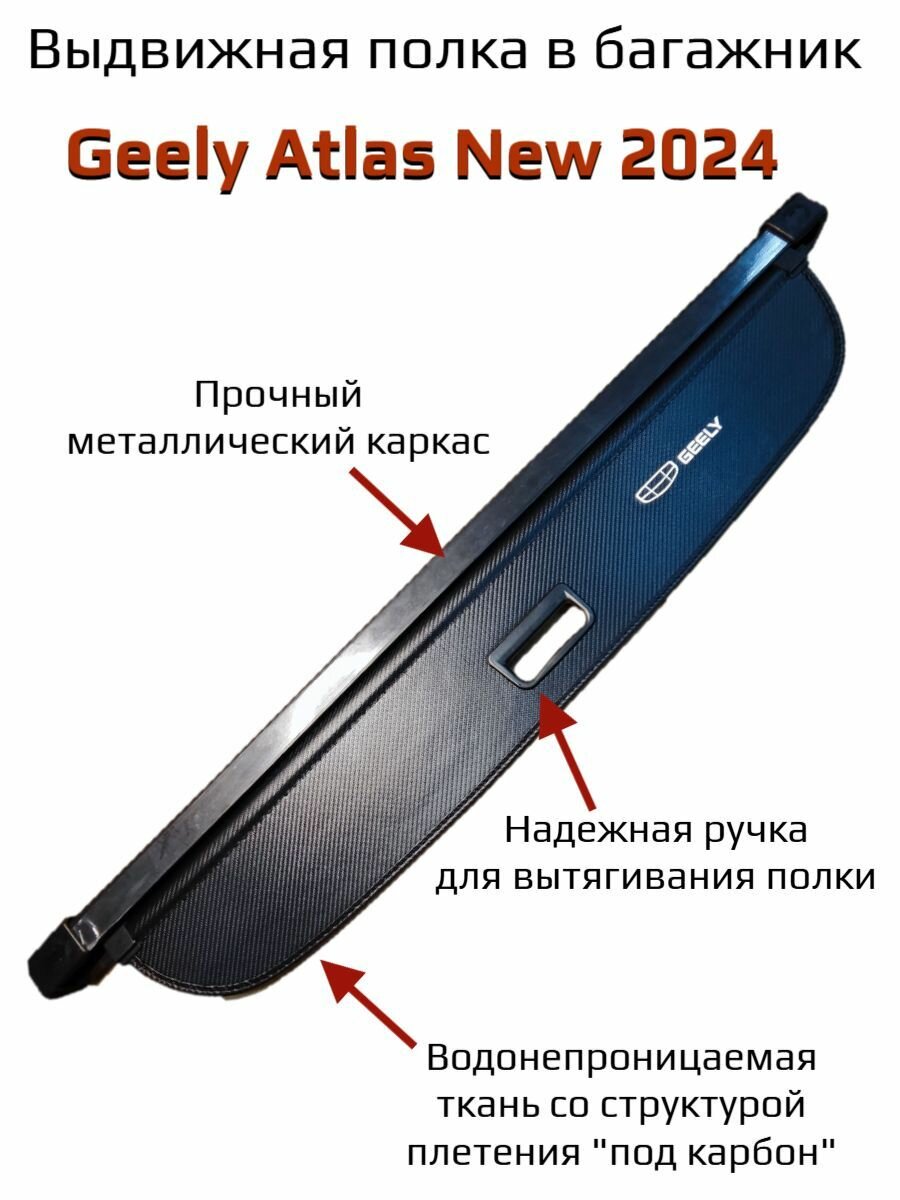Полка выдвижная для багажника автомобиля Geely Atlas New 2024 выполнена из прочного материала "с плетением под карбон", что придает полке дополнительную прочность, водонепроницаемость, устойчивость к царапинам и износу, а также материал не прихотлив в уборке и легко вытирается влажной тряпкой, не имеет свойства впитывать грязь. Шторка для багажника Джили атлас 2024 вставляется в штатные пазы на стенках багажника, ее установка занимает не более минуты, дополнительные инструменты для установки не требуются. Полка весит около двух килограмм, каркас полки выполнен из металла, что придает ей дополнительную надежность.