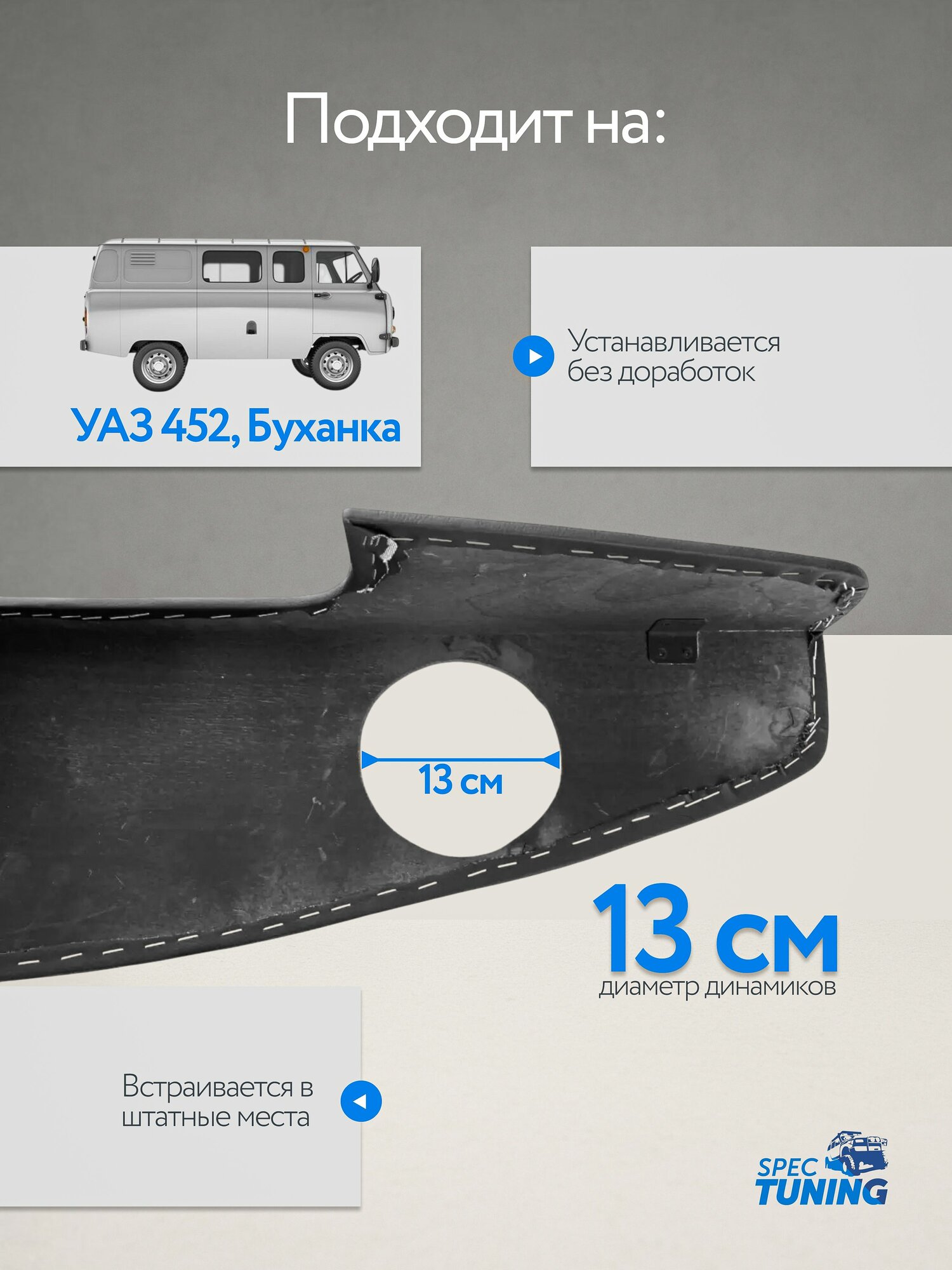 Полка для УАЗ 452 (Буханка) — это стильное и функциональное решение для вашего автомобиля. Она оснащена отверстиями под магнитолу и динамики диаметром 13 см, что позволяет легко установить аудиосистему и наслаждаться качественным звуком во время поездок.