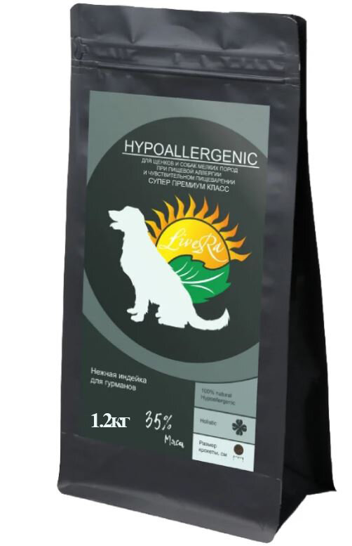LiveRa Hypoallergenic - нежная индейка для гурманов. В основу корма Hypoallergenic положен особый подход к природным компонентам для создания натурального полнорационного питания категории холистик, принимающего во внимание все факторы жизни животного. При разработке корма Hypoallergenic , наша цель - решение проблем ослабленных систем организма. Кроме того, что мы серьезно относимся к определению и использованию тех ингредиентов, которые удовлетворяют физиологические потребности собак, мы еще руководствуемся принципами устойчивого развития питомца.