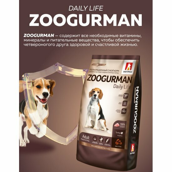 Полнорационный сухой корм для собак средних и крупных пород Zoogurman Daily Life, Индейка Здоровая кожа - Здоровое пищеварение - Крепкие кости и здоровые суставы