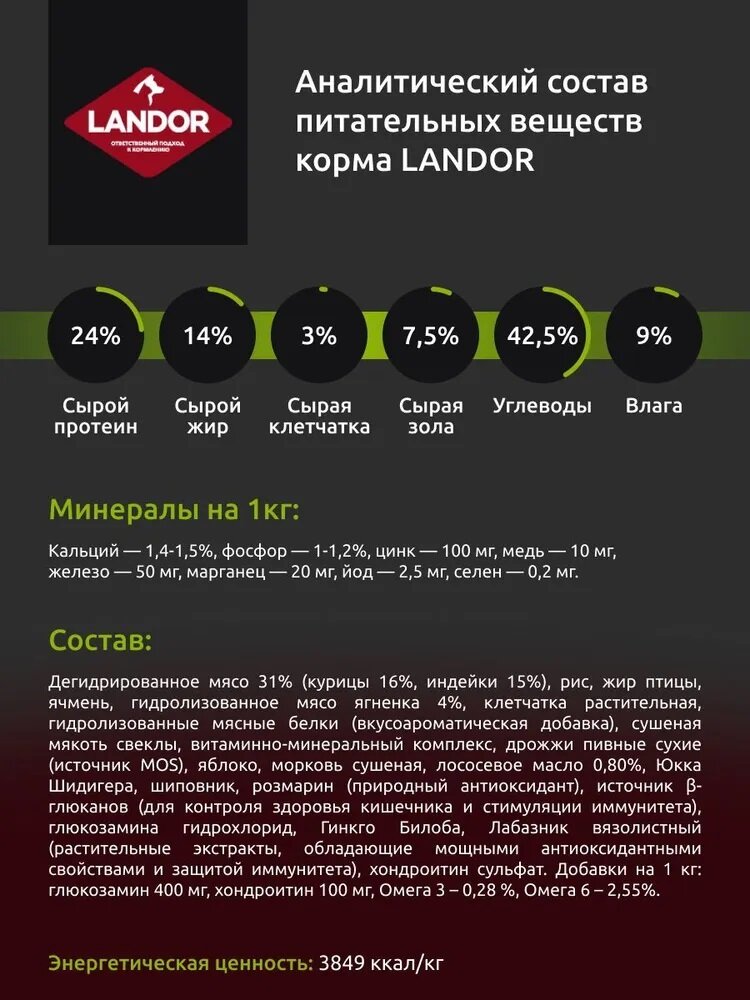 Состав: дегидрированное мясо 31% (курицы 16%, индейки 15%), рис, жир птицы, ячмень, гидролизованное мясо ягненка 4%, клетчатка растительная, гидролизованные мясные белки (вкусоароматическая добавка), сушенная мякоть свеклы, витаминно-минеральный комплекс, дрожжи пивные сухие (источник MOS), яблоко, морковь сушенная, лососевое масло 0,80%, Юкка Шидигера, шиповник, розмарин (природный антиоксидант), источник β-глюканов (для контроля здоровья кишечника и стимуляции иммунитета), глюкозамина гидрохлорид, Гинкго Билоба, Лабазник вязолистный (растительные экстракты, обладающие мощными антиоксидантными свойствами и защитой иммунитета), хондроитин сульфат.