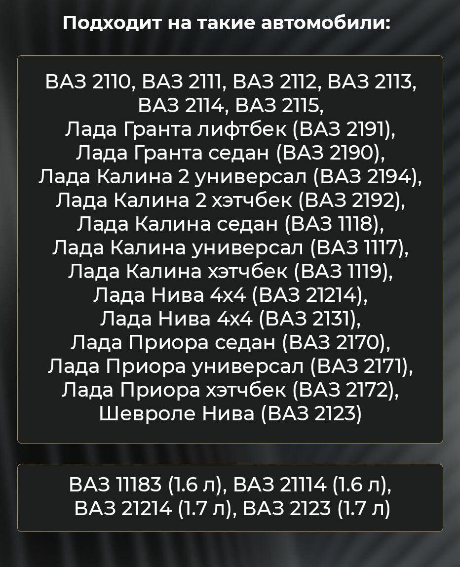 Благодаря своей универсальности он подходит для двигателей различных объемов - 1.6 л, 1.7 л, включая ВАЗ 11183 (1.6 л), ВАЗ 21114 (1.6 л), ВАЗ 21214 (1.7 л), ВАЗ 2123 (1.7 л).