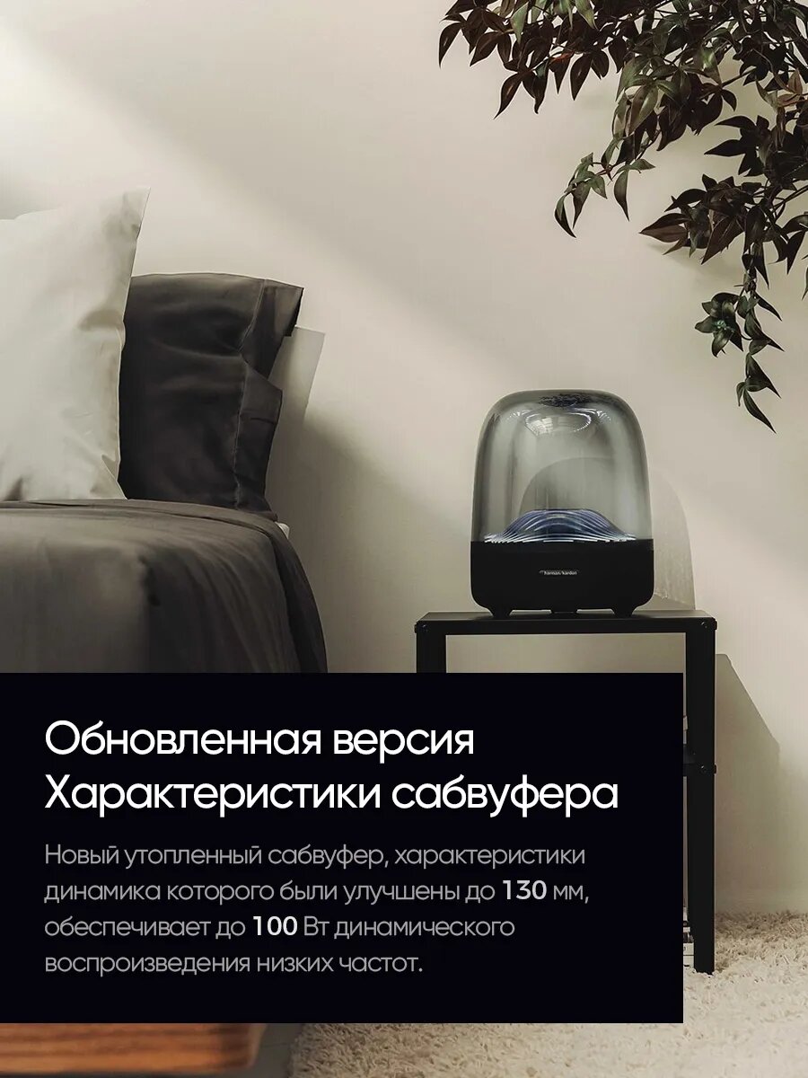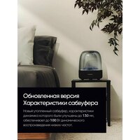 Harman/Kardon Aura Studio 3, как и предыдущая версия, оснащена встроенным сабвуфером, но его мощность значительно выросла и составляет 100 Ватт. Его динамик диаметром 130 мм расположен внизу, а наличие такого сабвуфера не только обеспечивает мощный бас и возможность с комфортом смотреть кино, но и достоверное воспроизведение частот от 45 Гц.