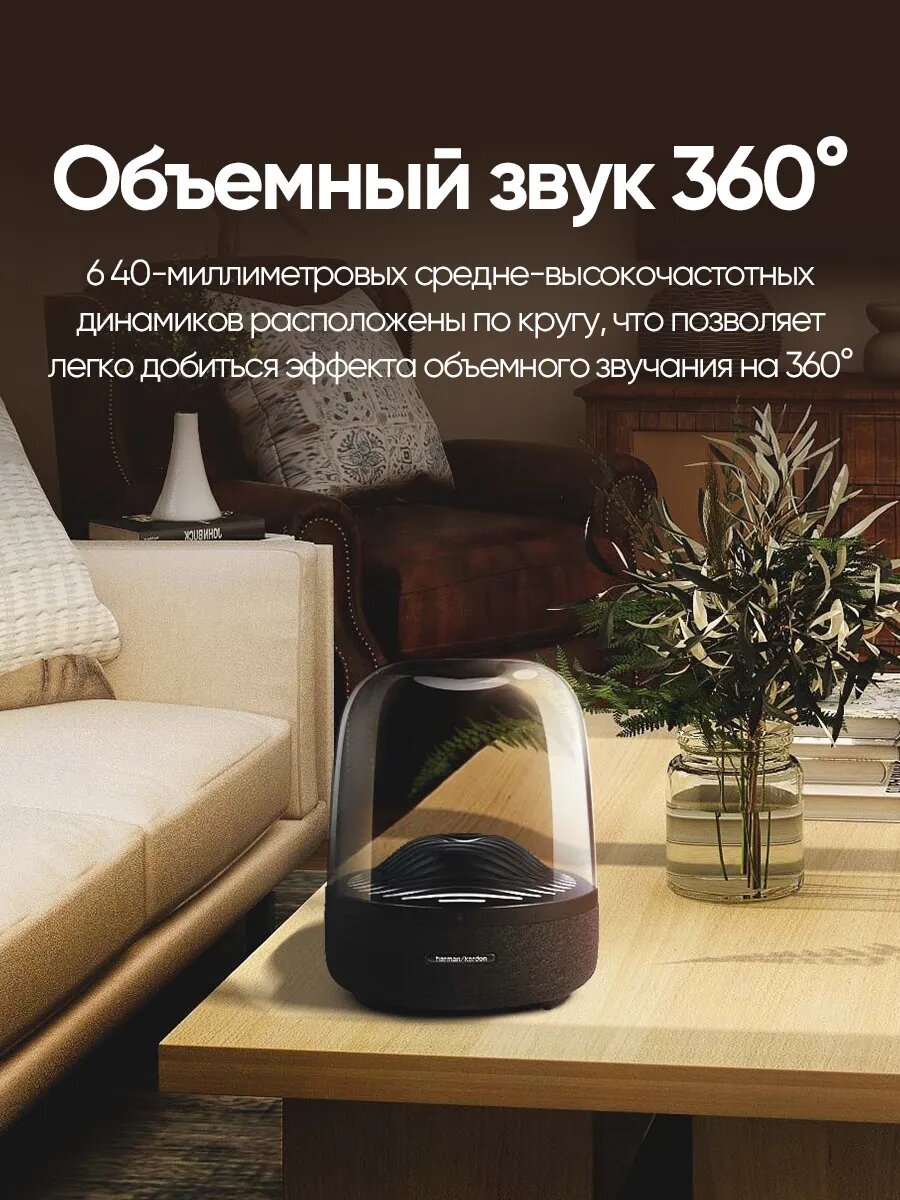 Премиальный материалы и эффектная прозрачная колба позволяют аудиосистеме легко сочетаться с любыми интерьерными стилями. Несмотря на впечатляющую мощность, Harman/Kardon Aura Studio 3 – довольно компактная акустика. Её диаметр составляет всего 23 сантиметра, а высота – 28 сантиметров, поэтому она легко поместится даже на кофейном столике.