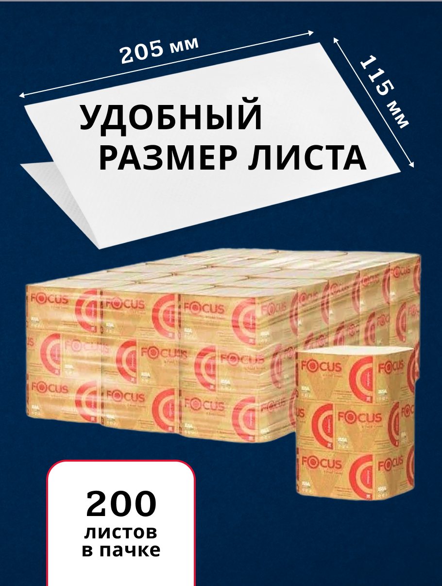 Полотенца бумажные листовые Focus Premium V-сложения 2-слойные 15 пачек по 200 листов Сложенные полотенца Focus размещаются в компактном диспенсере, который подойдет под любой интерьер. Листовая подача полотенец поможет лучше контролировать расход и обеспечит максимальную гигиеничность: полотенца выдаются поштучно, что исключает соприкосновение рук со следующим листом. Бумажные листовые полотенца - рациональное решение для мест с высокими требованиями к чистоте и гигиене. Упакованная в полиэтиленовый короб бумажная продукция подвержена меньшему влиянию окружающих факторов при транспортировке. Размеры: размер листа 20.5х23 см, размер пачки 20,5х10,7х11,5 см.