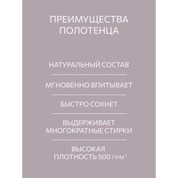 Махровое полотенце изготовлено из 100% хлопковой ткани махра. Основным отличием данного материала является высокая гигроскопичность. Она впитывает в себя до 200% влаги от своего объема, что в разы превышает показатели других хлопчатобумажных тканей. Такое полотенце благодаря особому плетению нитей (плотность 500 гр/м) обладает непревзайденной мягкостью. Цвет полотенца такой же яркий, как на картинке (фото товара реальное, а не 3D графика). Швы аккуратные и ровные, так как пошив осуществляется на промышленном швейном оборудование. При правильном уходе (стирка не более 40 градусов) прослужат долго сохранив форму и цвет. Производитель торговая марка «Гутен Морген». Вся продукция производится в России в городе Иваново, вот уже более чем 20 лет, строго из 100% хлопка, имеет сертификацию качества «Гост 31307-2005», а также зарегистрирована в государственной системе маркировки и прослеживания «Честный знак».