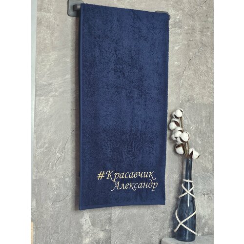 Полотенце махровое BIO-TEXTILES 70*140 с вышивкой #КРАСАВЧИК Александр темно-синее для мужчины мужу папе брату сыну банное в подарок 100% хлопок подарок на 14 февраля Святое Валентина для парочек