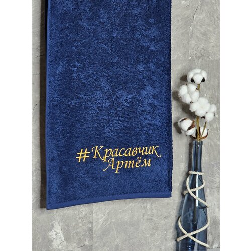 Полотенце махровое BIO-TEXTILES 70*140 с вышивкой #КРАСАВЧИК Артем темно-синее для мужчины мужу папе брату сыну банное в подарок 100% хлопок подарок на 14 февраля Святое Валентина для парочек