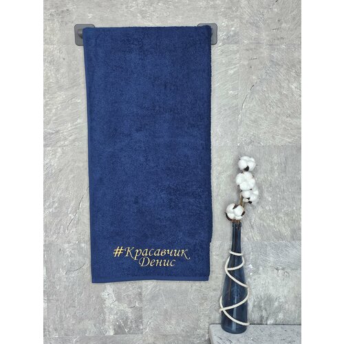 Полотенце махровое BIO-TEXTILES 70*140 с вышивкой #КРАСАВЧИК Денис темно-синее для мужчины мужу папе брату сыну банное в подарок 100% хлопок подарок на 14 февраля Святое Валентина для парочек