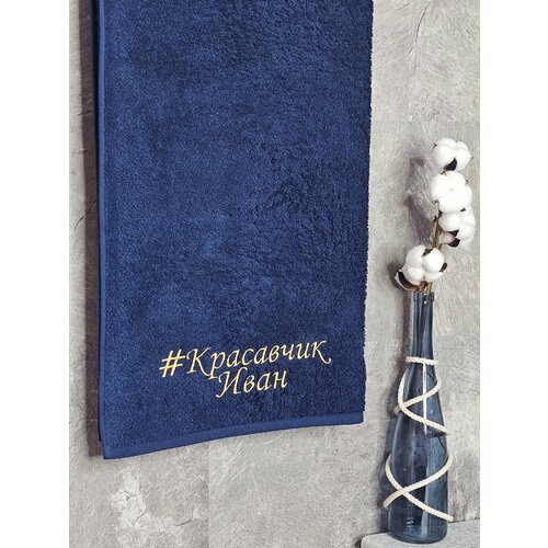 Полотенце махровое BIO-TEXTILES 70*140 с вышивкой #КРАСАВЧИК Иван темно-синее для мужчины мужу папе брату сыну банное в подарок 100% хлопок подарок на 14 февраля Святое Валентина для парочек