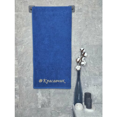 Полотенце махровое BIO-TEXTILES 70*140 с вышивкой #КРАСАВЧИК темно-синее для мужчины мужу папе брату сыну банное в подарок 100% хлопок подарок на 14 февраля Святое Валентина для парочек