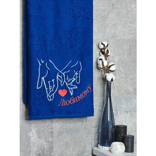 Полотенце махровое BIO-TEXTILES 70*140 с вышивкой любимому темно-синее для мужчины мужу папе брату сыну банное в подарок 100% хлопок подарок на 14 февраля Святое Валентина для парочек