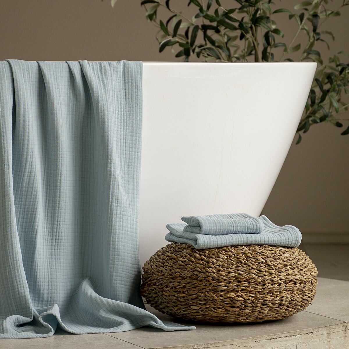 Голубой цвет полотенца и отсутствие рисунка делают его стильным и элегантным.