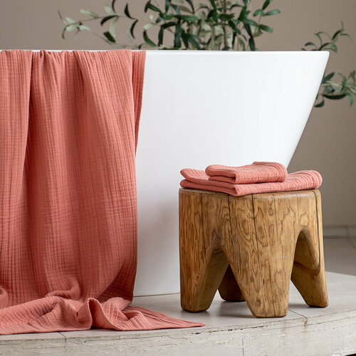Полотенце выполнено в терракотовом цвете без рисунка, что делает его стильным и элегантным аксессуаром для вашей ванной комнаты.
