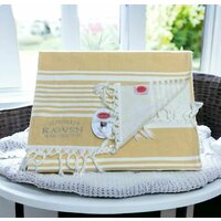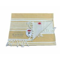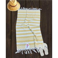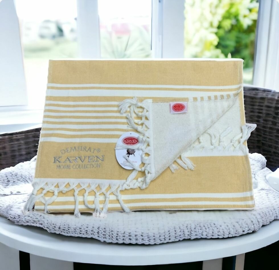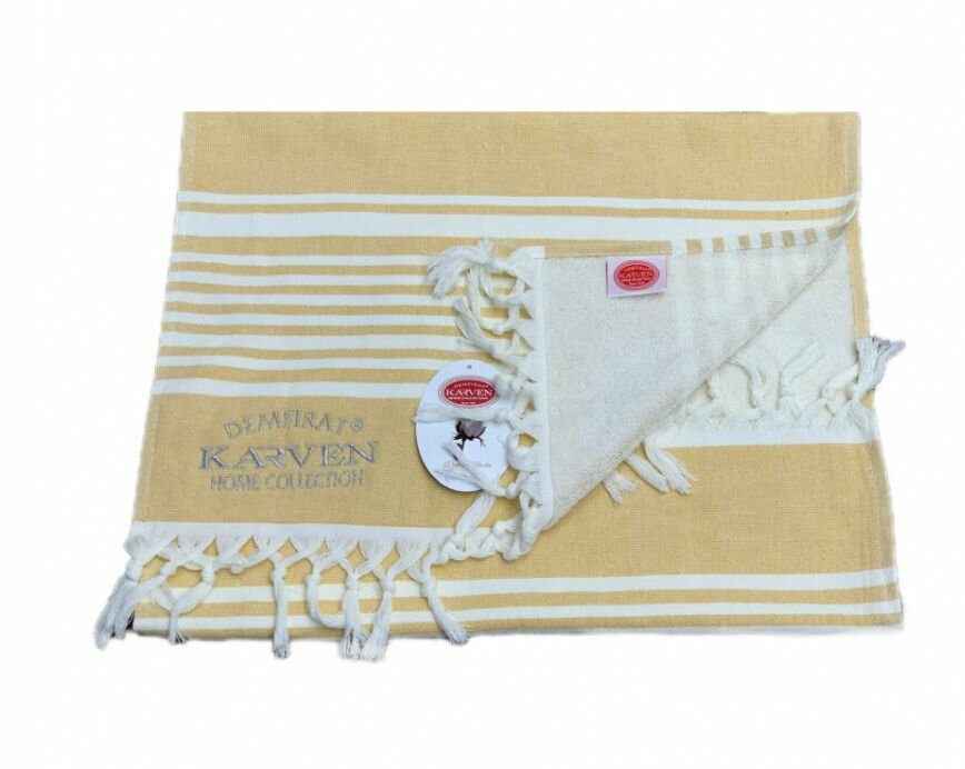 Полотенце из тонкого плотного хлопка с кистями в стильном полосатом дизайне. Внешняя сторона - тканный материал, внутренняя - пушистая махра. Прекрасное решение для дополнения вашего отдыха. Его можно использовать в сауне, бане, на пляже. Хлопок гипоаллергенный материал, он отлично впитывает влагу и быстро сохнет.