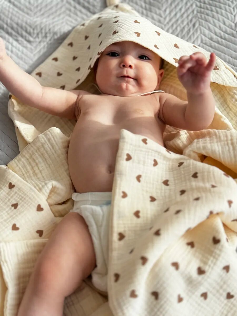 Идеальное полотенце уголок (шестислойное) из муслина для купания новорожденных! Представляем вам муслиновое детское полотенце с уголком для новорожденных, состоящее из муслина и имеющее размер 100x100 см. Для малыша наше муслиновое полотенце будет идеально так как оно мягкое и нежное , а так же способно обеспечить ему максимальный комфорт во время купания. Это полотенце с уголком из натурального муслина, в составе которого хлопок станет незаменимым аксессуаром для ванной вашего малыша. Благодаря своей муслиновой ткани, оно обеспечивает отличную впитываемость и мягкость. Дизайн полотенце с капюшоном для новорожденных сделан с расчетом на девочек и мальчиков, поэтому вы легко найдете то, что именно вам подойдет. Полотенце для детей с уголком также может быть идеальным подарком новорожденному для роддома или для выписки малыша. Вы сможете порадовать будущих родителей или подарить его своим друзьям как символ заботы и внимания. Полотенце для младенцев как подарок на рождения малыша будет приятным сюрпризом для молодых родителей. Наши мягкие и удобные хлопковые полотенца для детей из 100% хлопка станут незаменимым аксессуаром в ванной, в бассейне, или на пляже и даже для крещения. Муслин ( для новорожденных ) - это 100% натуральная ткань из хлопка, которая обеспечивает нежность и комфорт вашему ребенку. Детский уголок для детей - легкое, компактное и быстро сохнет, в отличие от полотенец из махры. Вам не придется беспокоиться о том, что ваш ребенок будет мокрым или мерзнет после купания.