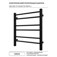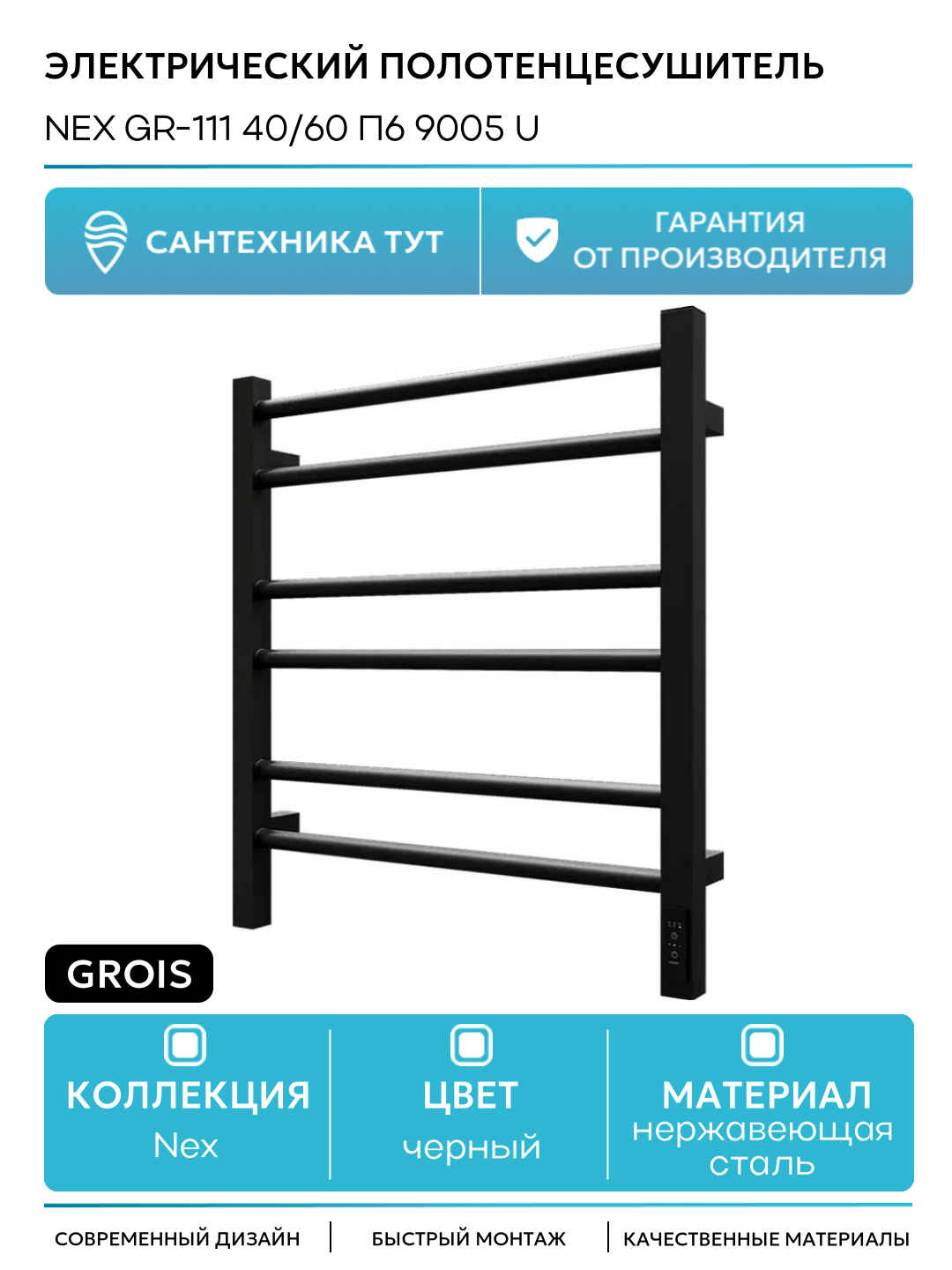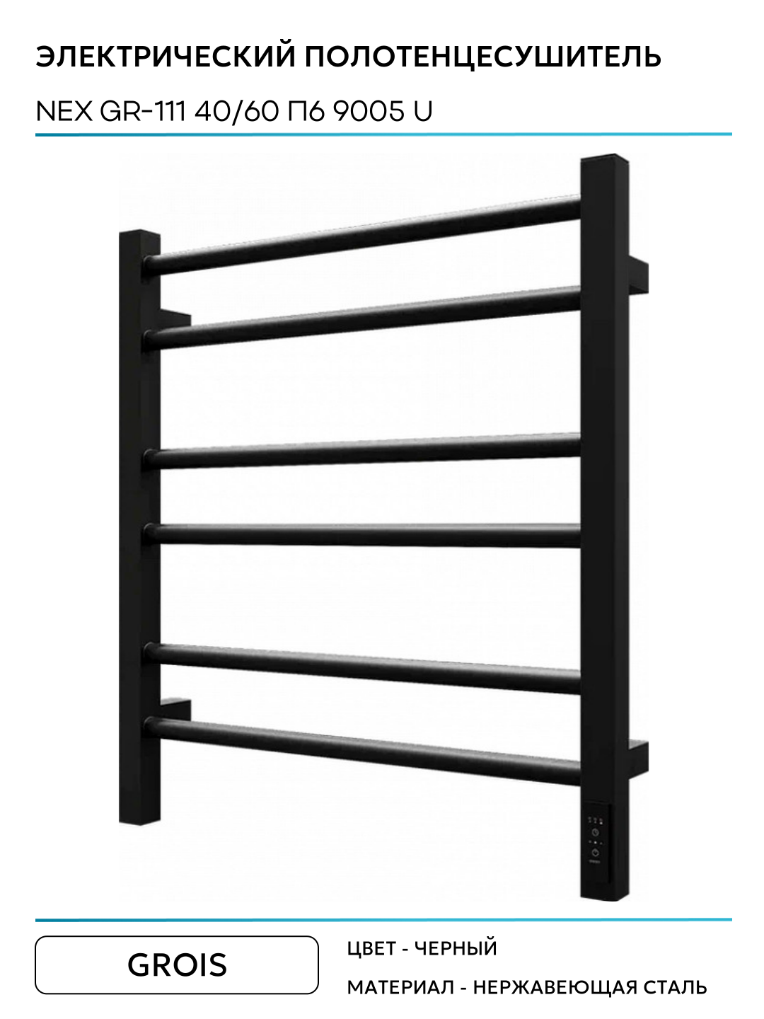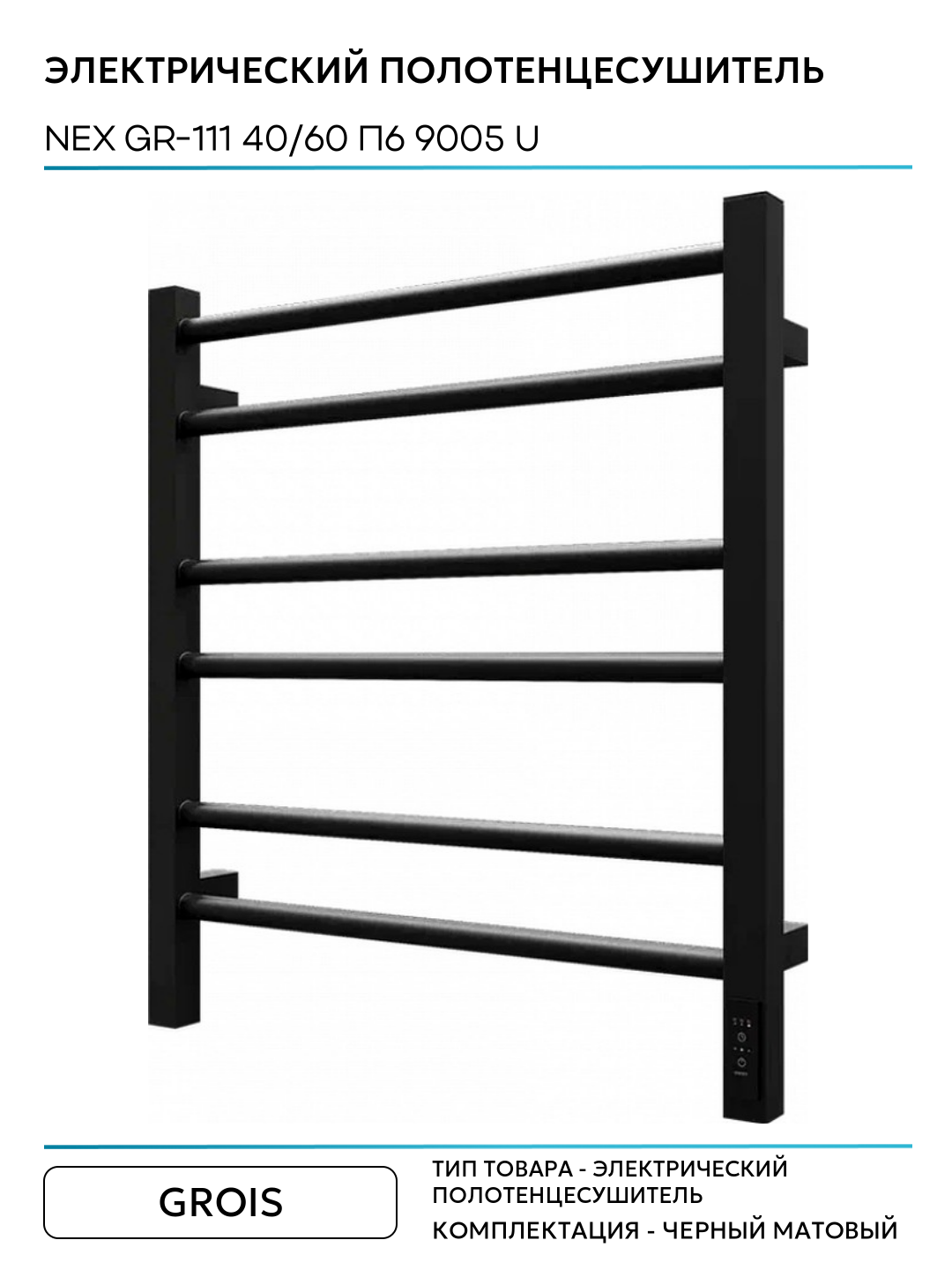 Полотенцесушитель электрический с терморегулятором GROIS Nex GR-111 400 х 600мм черный матовый: сравнение цен, характеристики, фото, актуальное наличие и цены.