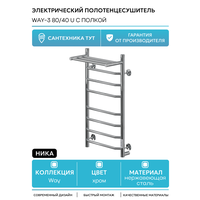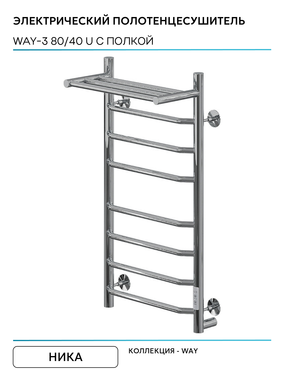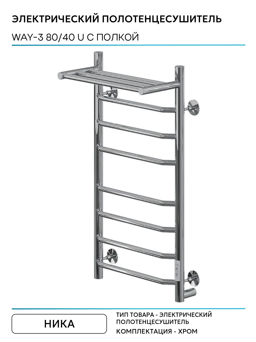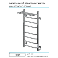 Полотенцесушитель электрический глянцевый (хром) от Ника модель WAY-3 800x400мм с полкой и "правый тэн" - это значит блок управления справа, а также он имеет универсальное подключение из коробки.
