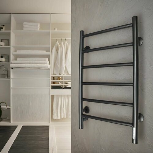 Уникальный сушитель для полотенец в ванную электрический, отлично подойдет там где сантехника в цвете сатиновый / матовый хром либо графит/ никельный цвет, сочетается во всем, а круглые элементы настенного дополнят общий стиль.
