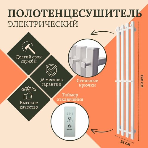Полотенцесушитель электрический белый 120х21см Маргроид, квадратная труба, вертикальный