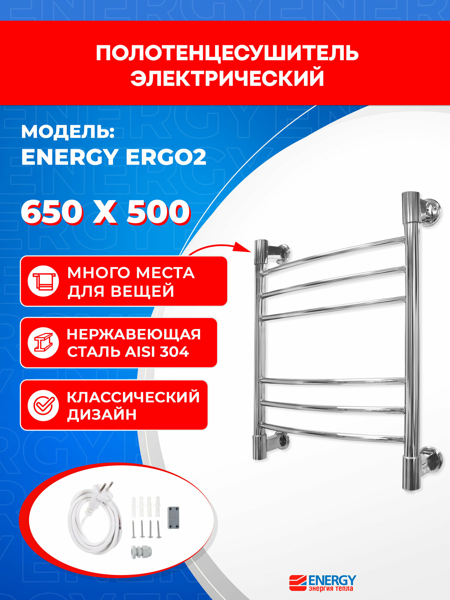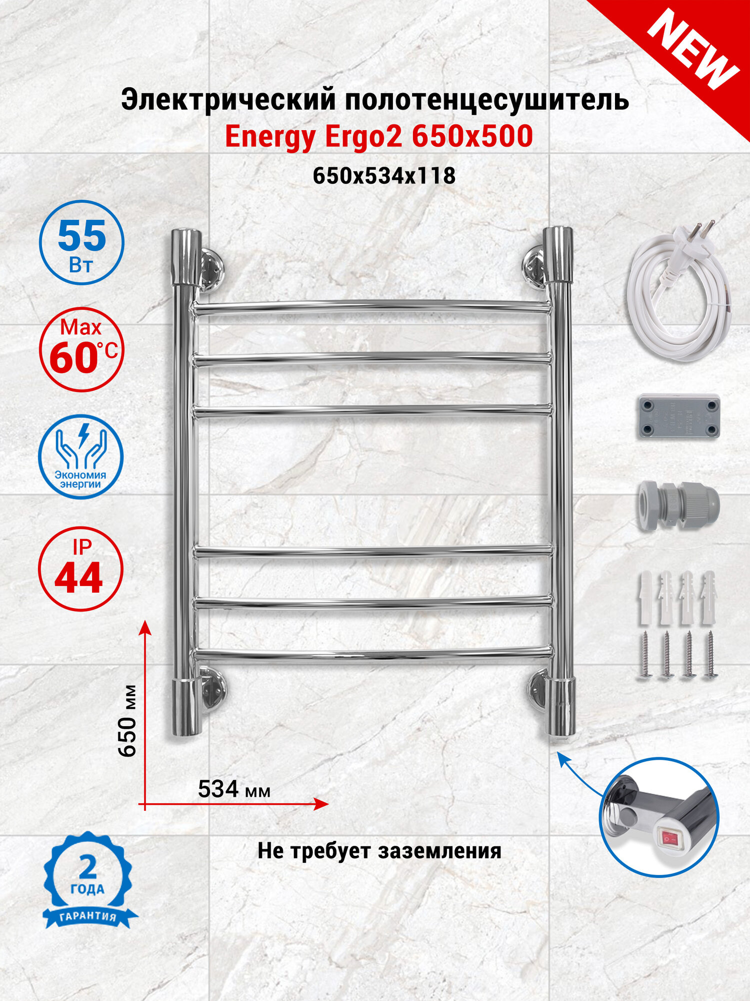 Полотенцесушитель электрический Energy Ergo2 650×500, цвет хром, тип «лесенка», скрытое/наружное подключение: сравнение цен, характеристики, фото, актуальное наличие и цены.