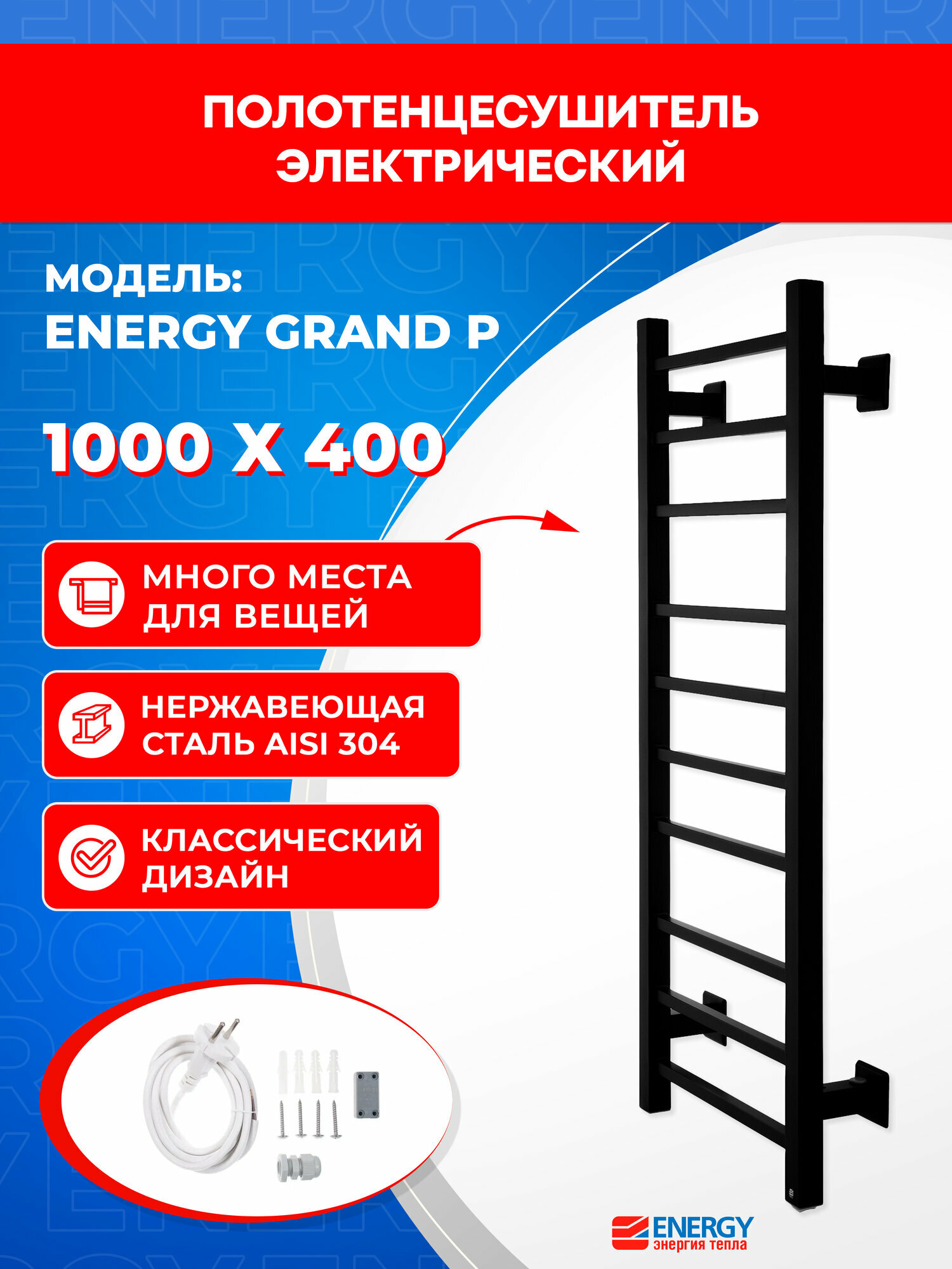 Купить Полотенцесушитель электрический Energy Grand P 1000×400 черный, квадратный прямой профиль, скрытый/наружный монтаж с доставкой по всей России. Полотенцесушитель электрический Energy Grand P 1000×400 черный, квадратный прямой профиль, скрытый/наружный монтаж: сравнение цен, характеристики, фото, актуальное наличие и цены.