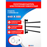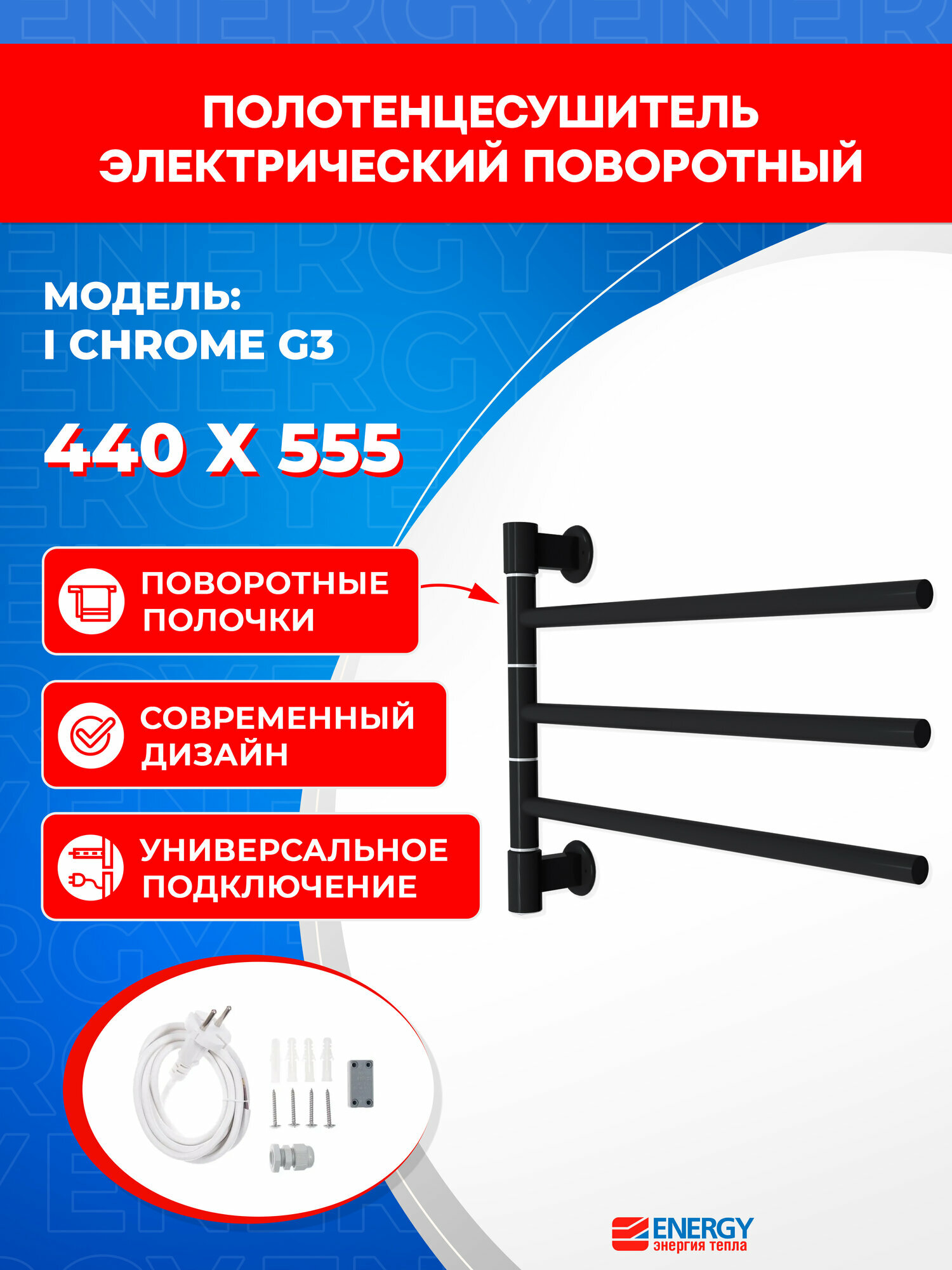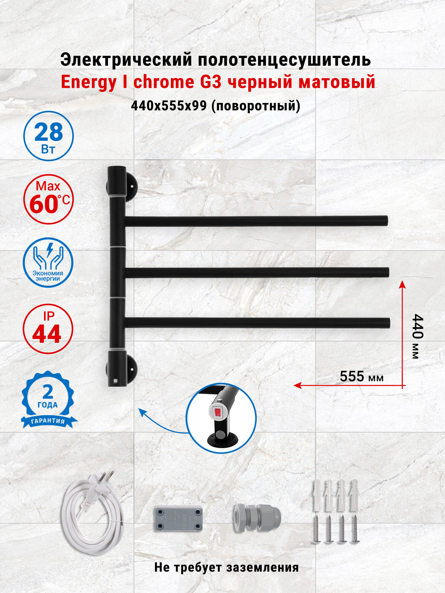 электрический полотенцесушитель energy (энерджи) i chrome g3 ral 9005 черный матовый - это компактная модель, особенностью которой является поворотная конструкция. прибор состоит из трех спиц из нержавеющей стали, внутри которых находится нагревательный кабель, а снизу расположен кнопочный выключатель.
