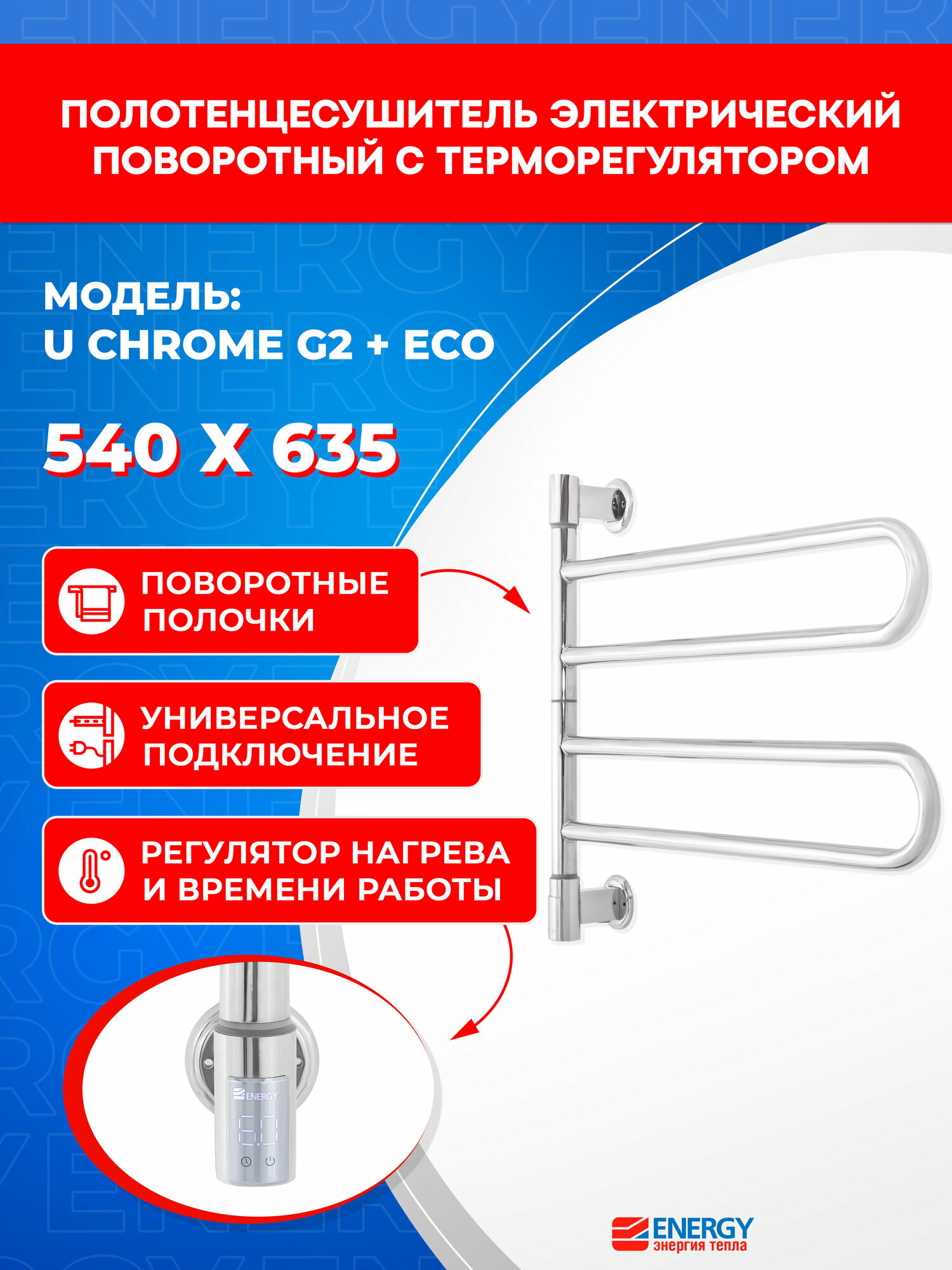 Купить Полотенцесушитель электрический Energy U chrome G2 + ECO 1 поворотный, цвет хром, скрытое/наружное подключение с доставкой по всей России.