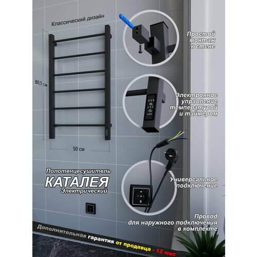 Представляем вашему вниманию электрический полотенцесушитель Каталея в стильном черном матовом исполнении. Его размеры 500х800 мм идеально впишутся в любую ванную комнату, обеспечивая максимальную эффективность при сушке полотенец и других текстильных изделий. Этот универсальный прибор станет не только практичным, но и эстетически приятным дополнением вашего интерьера.