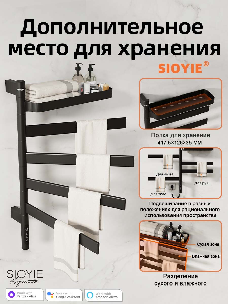 Купить Полотенцесушитель электрический поворотный SIOYIE 450мм 680мм, Wi-Fi и Алисы, нержавеющая сталь черный форма F-образная с доставкой по всей России.