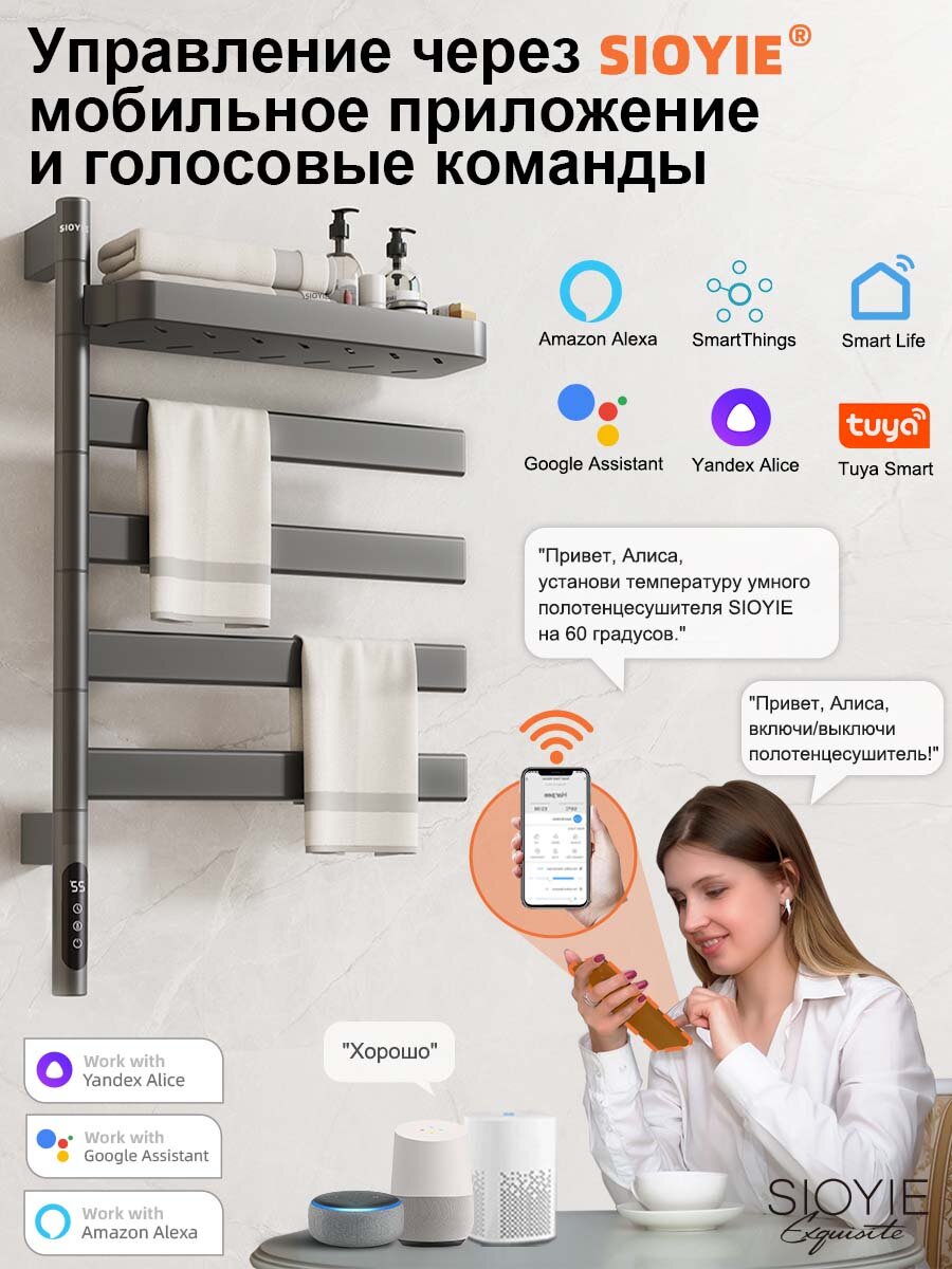 Купить Полотенцесушитель электрический поворотный SIOYIE 450мм 680мм, Wi-Fi и Алисы, нержавеющая сталь серый форма F-образная с доставкой по всей России.