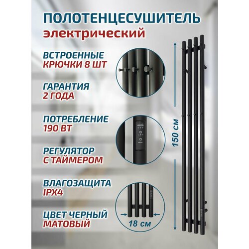| Дополнительная информация | комплектация: полотенцесушитель в сборе - 1 шт., коробка скрытого монтажа - 1 шт., комплект кронштейнов для крепления к стене - 1 к-т., кабель для подключения к сети 220 В - 1 шт., технический паспорт изделия / гарантийный талон - 1 шт., упаковка - 1 шт.; материал - углеродистая сталь 08ПС; 3 режима таймера: 2, 4, 6 часов; 3 режима терморегулятора: 40, 50, 60 градусов; температура поверхности изделия: 30 - 60 °С ± 5 °С; автоотключение при нагреве до 60-65 °С; степень влагозащиты - IPX4; время нагрева: 20-40 минут |