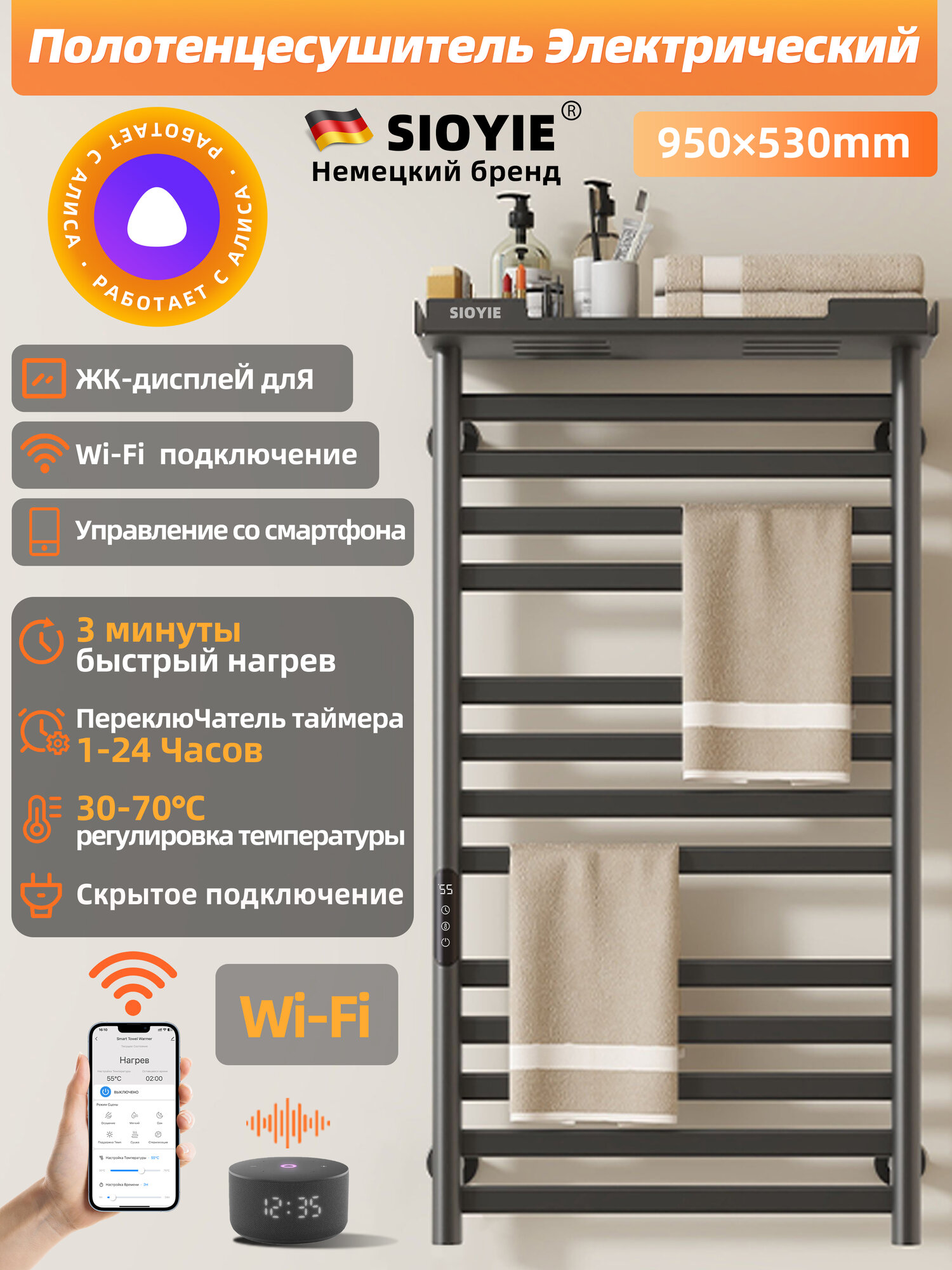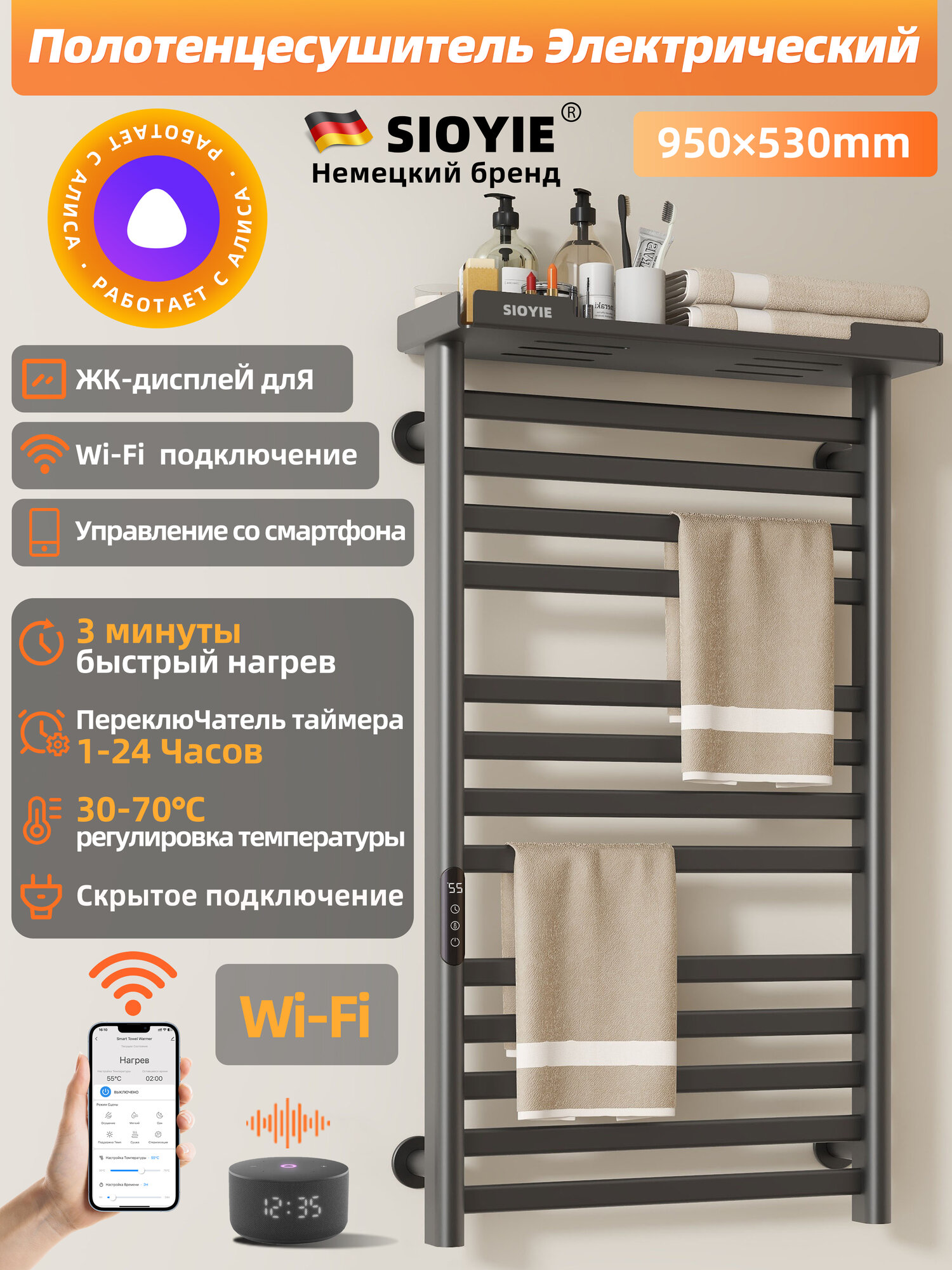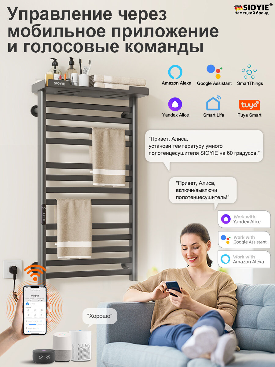 Купить Полотенцесушитель электрический SIOYIE YV7ULTRAW 530мм 950мм с терморегулятором серый подключение слева форма с доставкой по всей России.