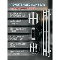 | Дополнительная информация | комплектация: полотенцесушитель в сборе - 1 шт., коробка скрытого монтажа - 1 шт., комплект кронштейнов для крепления к стене - 1 к-т., кабель для подключения к сети 220 В - 1 шт., технический паспорт изделия / гарантийный талон - 1 шт., упаковка - 1 шт.; материал - углеродистая сталь 08ПС; 3 режима таймера: 2, 4, 6 часов; 3 режима терморегулятора: 40, 50, 60 градусов; температура поверхности изделия: 30 - 60 °С ± 5 °С; автоотключение при нагреве до 60-65 °С; степень влагозащиты - IPX4; время нагрева: 20-40 минут |