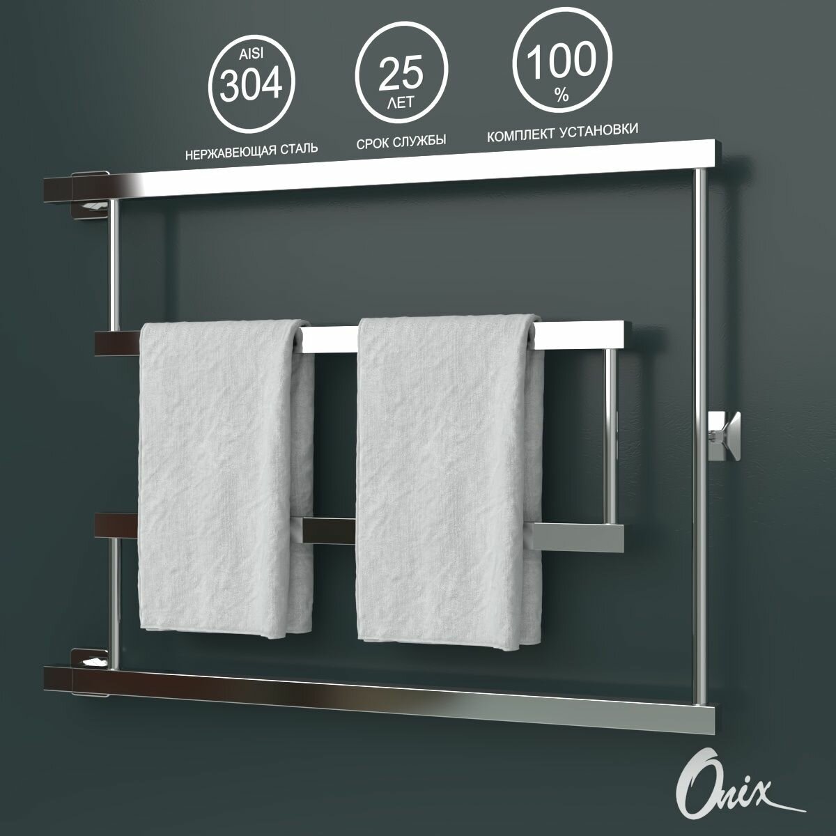 Купить Полотенцесушитель Водяной Onix, модель Vega Turn Left 600×800, фокстрот с боковым угловым подключением справа, нержавеющая сталь, полный комплект с доставкой по всей России.