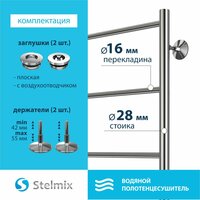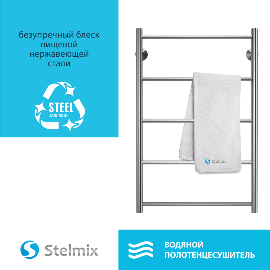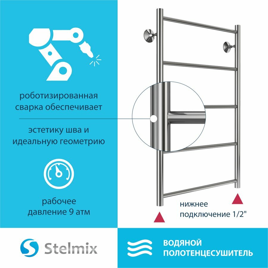 Полотенцесушитель водяной STELMIX (стелмикс) Прямая форма П5 50х80 см - идеальное решение для небольших ванных комнат. Общая ширина изделия - 53 см, высота - 80 см, межосевое расстояние - 50 см. Тип подключения - нижнее. Количество перекладин - 5. Полотенцесушитель предназначен для создания комфортного микроклимата в ванной комнате площадью 2,3 м2. Теплоотдача 250 вт/ч. Рабочее давление - 9 Атм. Производство полотенцесушителя - завод TERMINUS, Россия. Более 20 лет производим полотенцесушители и дизайн-радиаторы из нержавеющей стали. Приобретая наши изделия, Вы получаете высокое качество по доступной цене. Изготовлен из пищевой нержавеющей стали. Плазменная полировка полотенцесушителя стелмикс обеспечивает зеркальную и гигиеническую поверхность, которая не потускнеет в течение всего срока эксплуатации. Полотенцесушитель водяной изготавливается путём роботизированной лазерной сварки, которая гарантирует стойкость к гидроударам, эстетичность шва, максимальную прочность и герметичность изделия. Гарантия от производителя 5 лет, лазерная гравировка на полотенцесушителе. Для установки полотенцесушителя необходимо приобрести: угловые соединения со сгоном или вентиля в количестве 2 шт, отражатели в количестве 2 шт.
